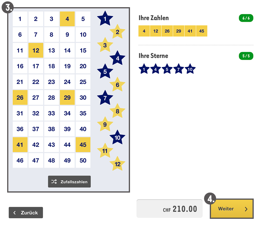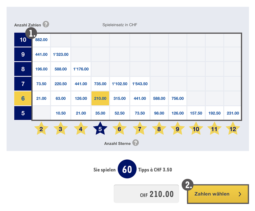Abhängig von der gewählten Anzahl an Zahlen und Sternen ergibt sich der Preis des Systems und wie viele Tipps dieses umfasst. - Mit einem Klick auf „Zahlen wählen“ gelangen Sie zum nächsten Schritt.