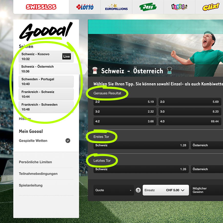 Von A wie Anschlusstreffer bis Z wie Zuckerpass – die virtuellen Fussballspiele von Swisslos bieten alles, was das Fussballherz begehrt. Und sogar noch mehr! Bei Goooal spielen Sie nicht bloss für die Galerie, sondern stauben Sie mit den richtigen Tipps sogar stolze Gewinne ab, und das rund um die Uhr! Alle vier Minuten steigt ein neues Spiel. Sie können auf das genaue Resultat tippen und darauf, welche Mannschaft das erste und welche das letzte Tor schiessen wird. Die besten Szenen des Spiels werden in einem Highlight-Video zusammengefasst. Fiebern Sie mit, ob Sie mit Ihrem Tipp einen Volltreffer gelandet haben.