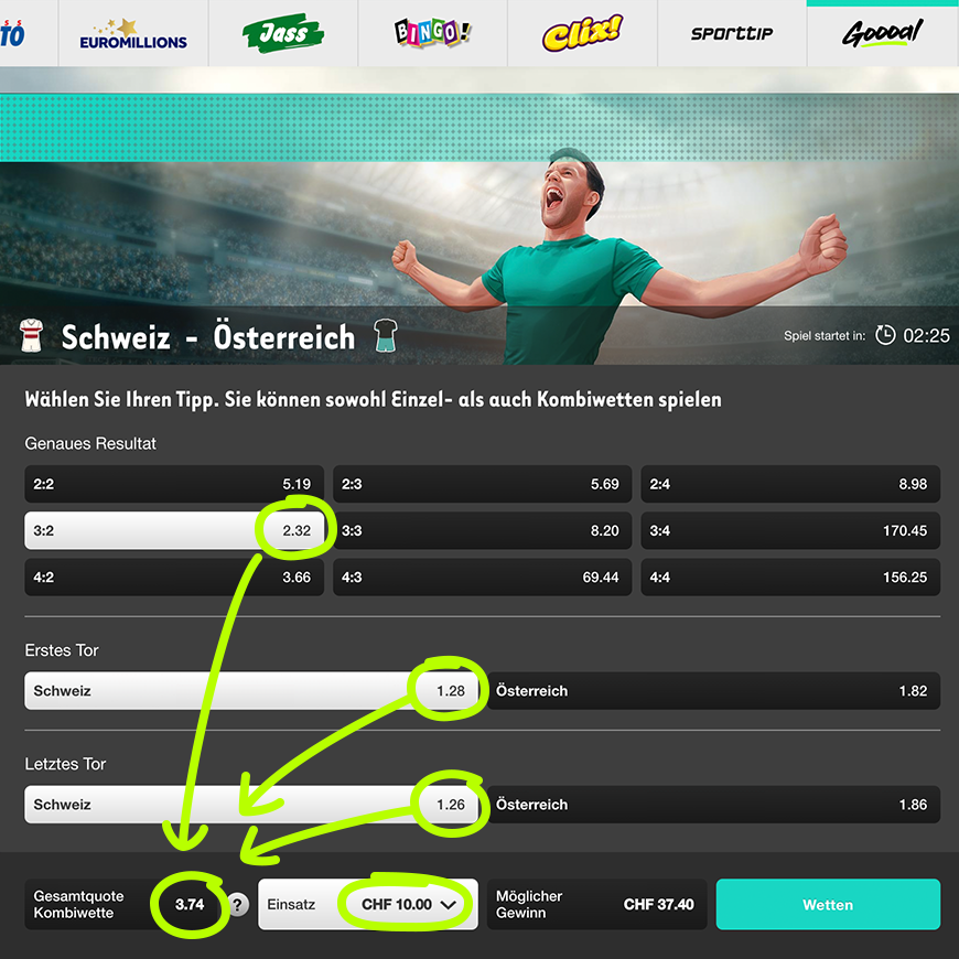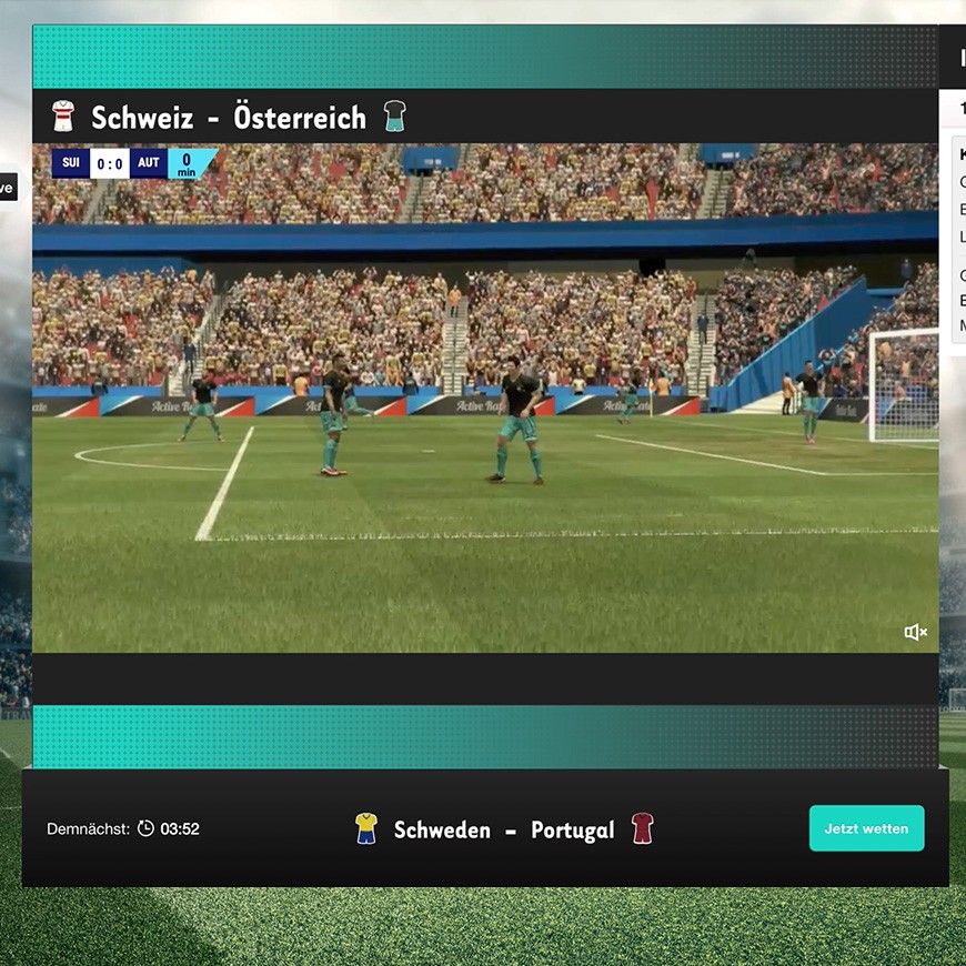 - Nach dem Annahmeschluss erfolgt die Ziehung. Sie bestimmt zufällig, wie das Resultat des anschliessend gezeigten virtuellen Fussballspiels lautet und welches Team das erste und welches das letzte Tor erzielt.