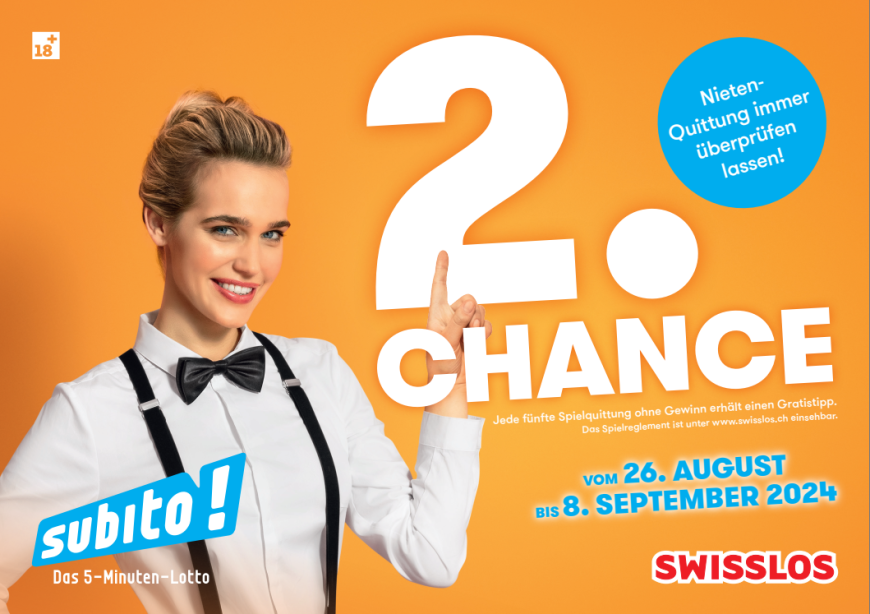 Vom 26.08. bis maximal 08.09.2024 gewinnt jede fünfte eingelöste Nieten-Spielquittung sofort einen Gratistipp im Wert von 4 Franken.