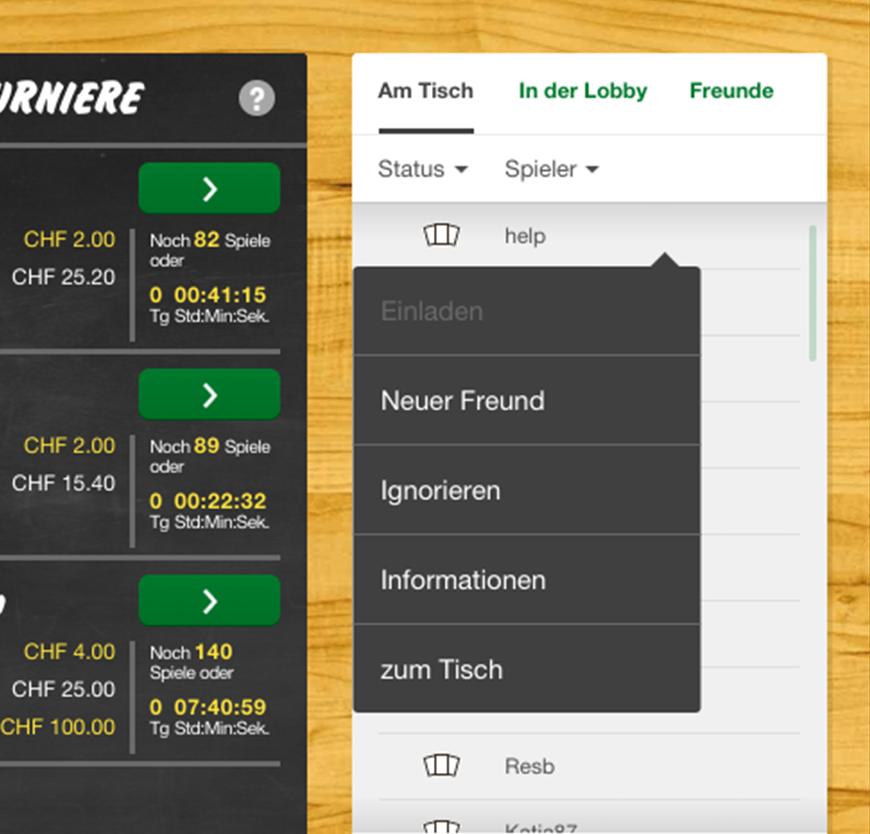 Sie können die Liste nach Ihren Wünschen ordnen und filtern, Mitspieler als Freunde definieren oder sperren, diese zu einer Jass-Runde einladen (Klick auf «Einladen») oder sich Informationen über den entsprechenden Spieler anzeigen lassen («Informationen»).