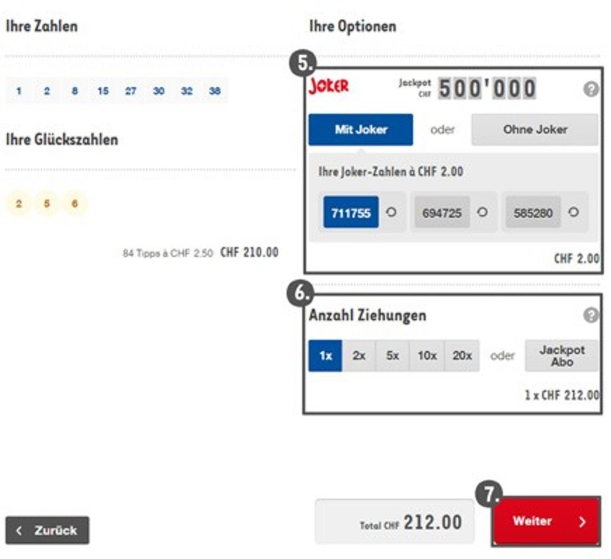 - Wählen Sie, ob Sie Swiss Lotto mit oder ohne Joker spielen wollen. Sie können bis zu drei Joker-Zahlen spielen. Jede Joker-Zahl kostet CHF 2.00.