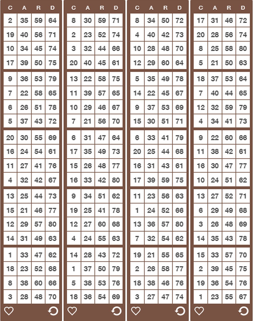 80-number Bingo is played on a 4x4 Bingo card. Every Bingo card thus has 16 different numbers.