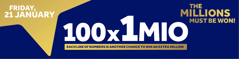 In the draw held on 21 January 2022, 100 winners will be drawn from among all participation codes. The lucky players with one of the 100 winning codes on their entry confirmation ticket will be 1 million* richer. The winning codes drawn will be published with the EuroMillions winning numbers on Swisslos’s website.