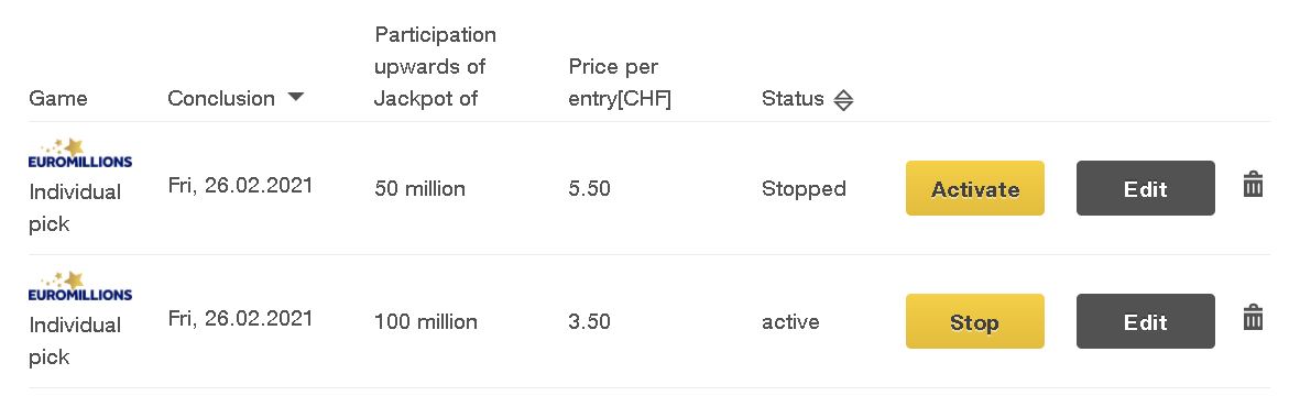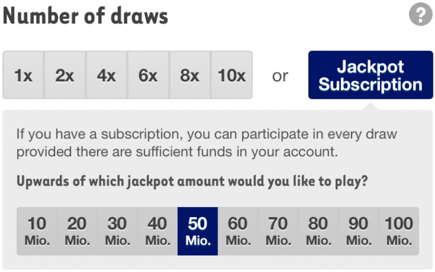 You can select the number of draws under «Individual picks» or «System picks». If you choose «Jackpot Subscription», you will automatically be entered in every draw whenever the jackpot reaches the amount you have selected and you have enough money in your game account. This will apply until you revoke it. If the balance in your game account is insufficient for your subscription, we will contact you immediately via e-mail.