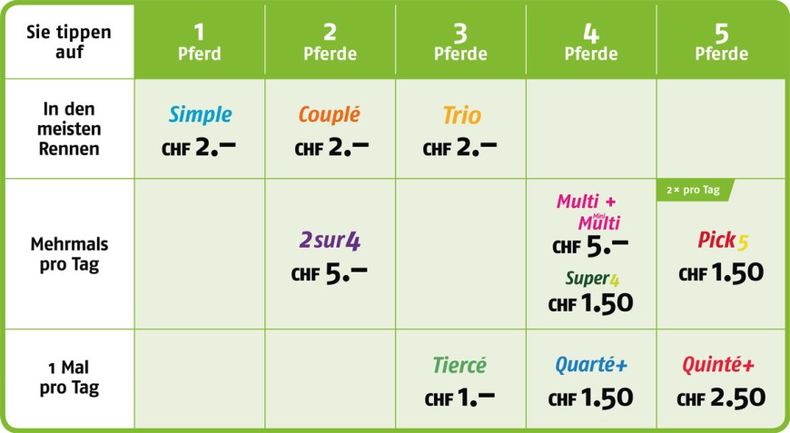 PMU is the classic horse-racing bet, with daily live broadcasts and the most thrilling horse races from all over the world. At selected sales outlets (mainly catering establishments in German-speaking Switzerland), you can play PMU, follow the races on a screen and place bets. There are a range of different PMU bets, all offering a chance to win attractive prizes.