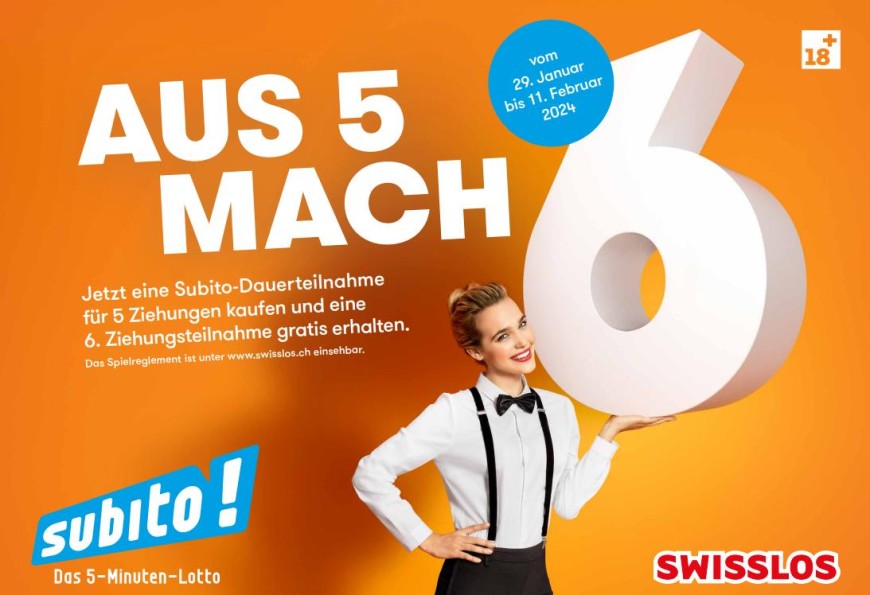 Make the most of an attractive special offer from 29 January to 11 February 2024, thanks to the new «Subito» with subscription plays. For every purchase of a «Subito» subscription play with 5 draws, you get a 6th draw completely free. So even more chances to win!