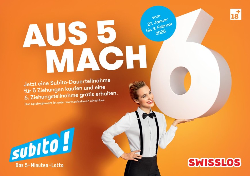 Make the most of an attractive special offer from 27 January to 9 February 2025, thanks to the new «Subito» with subscription plays. For every purchase of a «Subito» subscription play with 5 draws, you get a 6th draw completely free. So even more chances to win!
