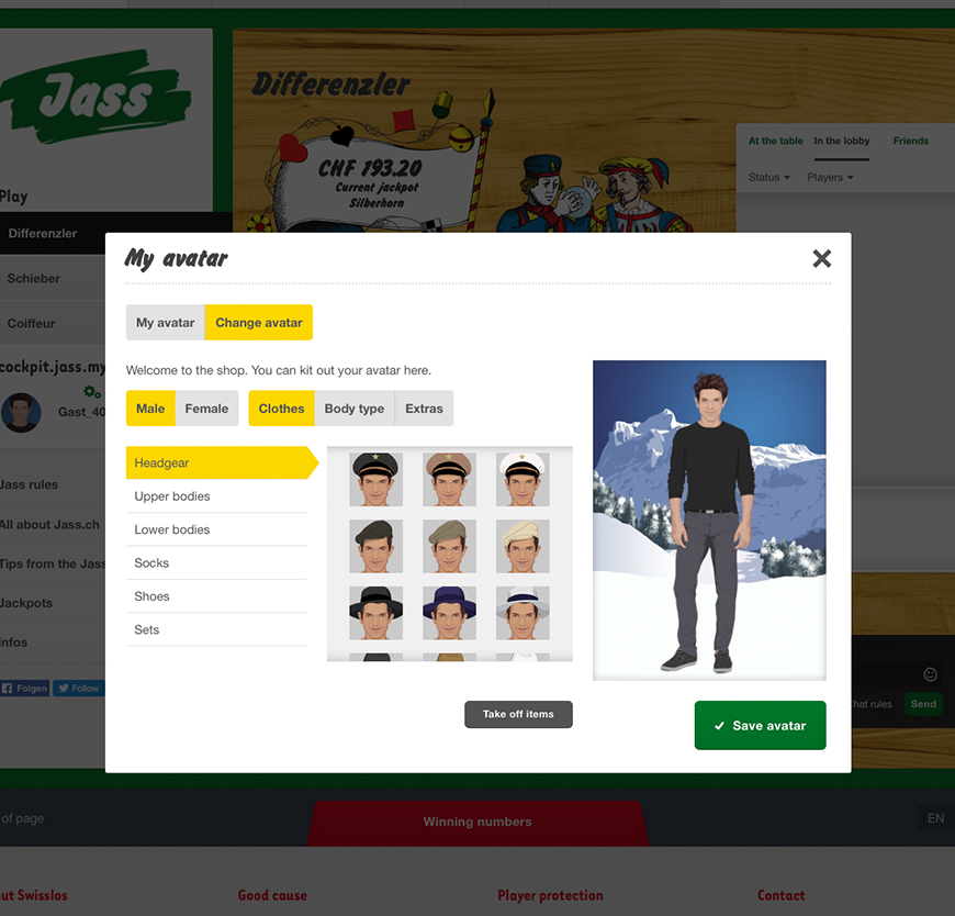 Your personal avatar is the icon that represents you at the playing table and on Jass.ch. You can customize your avatar with clothes and accessories.