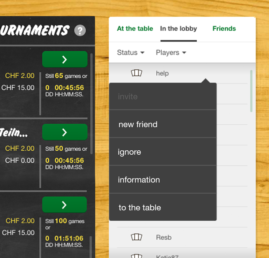 You can order and filter the list as you wish, define players as friends or block them, invite them to participate in a Jass round (click on “Invite”) or bring up information about the players concerned (“Information”).