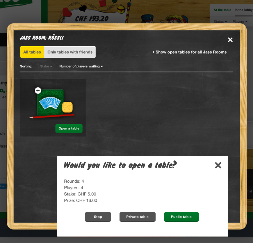 Click on “Open table” in the chosen Jass Room. A dialog box will open for setting up the game. You can set up a private (Differenzler only) or public table.