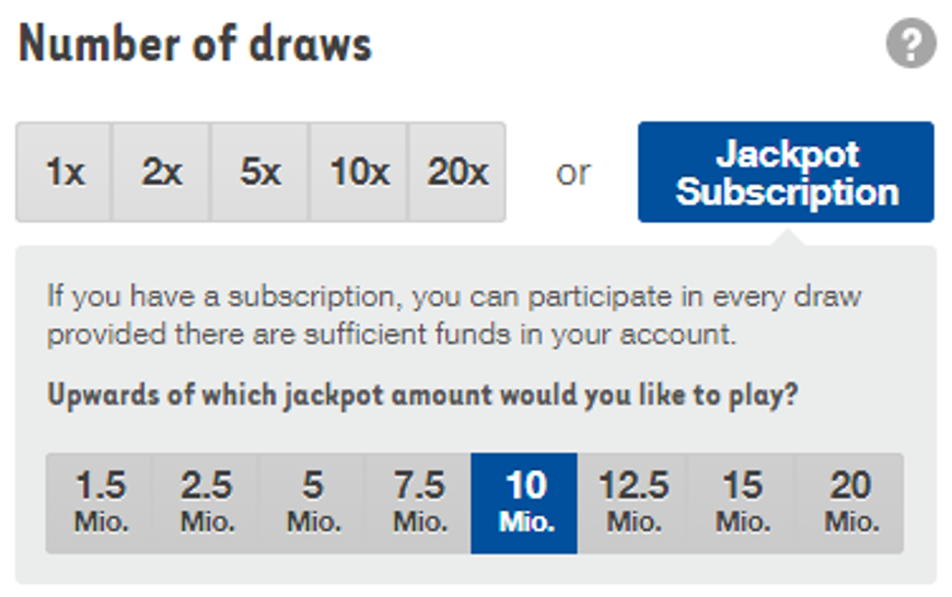 You can select the number of draws under «Individual picks» or «System picks». If you choose «Jackpot Subscription», you will automatically be entered in every draw whenever the jackpot reaches the amount you have selected and you have enough money in your game account. This will apply until you revoke it. If the balance in your game account is insufficient for your subscription, we will contact you immediately via e-mail.