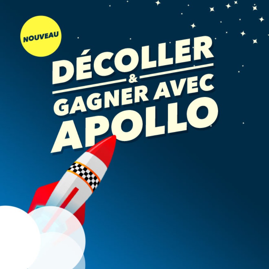«Apollo», le nouveau Bingo a des allures de fusée. 30 numéros, 30 boules, 3 rangs de gain pour seulement 80 centimes la carte Bingo. Tentez votre chance et décrochez la lune avec «Apollo».
