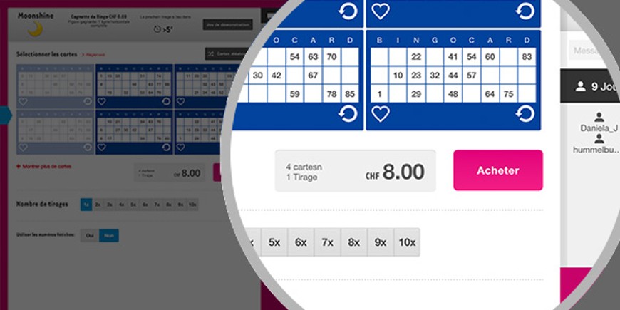 Vous avez certainement déjà vécu cette situation : le jackpot de votre Bingo préféré grossit et grossit encore, le prochain tour démarre déjà. Grâce au nouveau mode d’achat rapide, il suffit de quelques secondes pour que vous soyez à nouveau dans le feu de l’action. Choisissez la quantité de cartes que vous souhaitez acquérir, les cartes vous sont attribuées aléatoirement et participent immédiatement à la course au jackpot du Bingo.