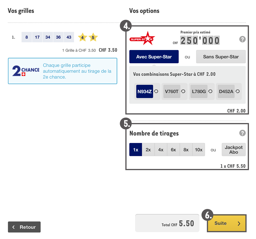 4. Indiquez si vous désirez jouer à EuroMillions avec ou sans Super-Star. Vous pouvez jouer jusqu’à 4 combinaisons Super-Star. Chaque combinaison Super-Star coûte CHF 2.00.