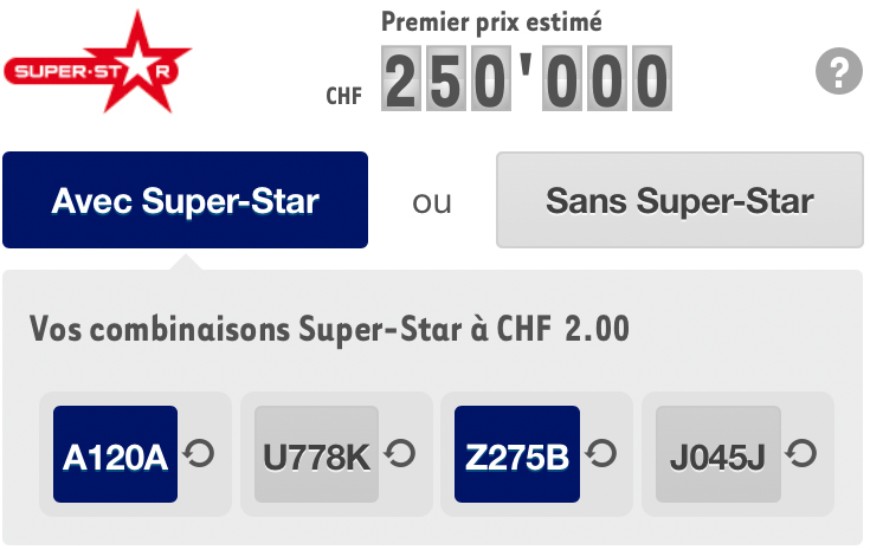 Si vous désirez changer la combinaison Super-Star proposée par le système, il vous suffit de cliquer sur le symbole situé à côté de la combinaison Super-Star. Le système propose alors une nouvelle combinaison alphanumérique.