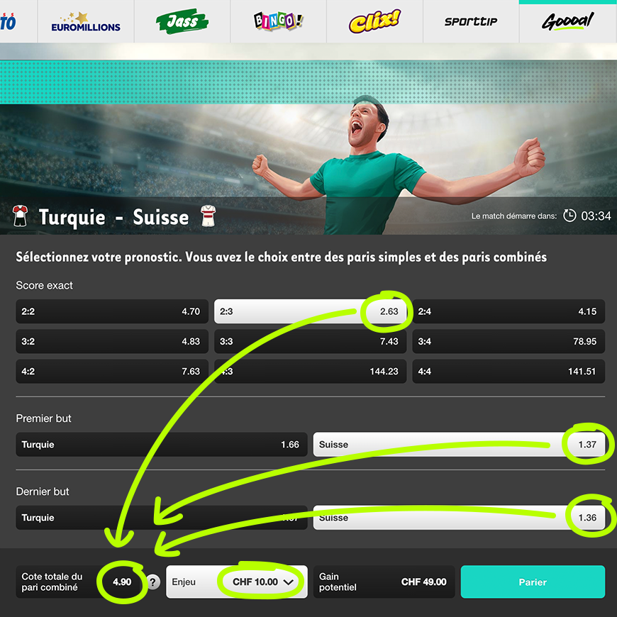 La cote de votre pari s’affiche en bas à gauche. Si vous combinez différents pronostics, la cote totale est calculée en multipliant les différentes cotes entre elles. Plus la cote est élevée, plus le gain potentiel est élevé.
