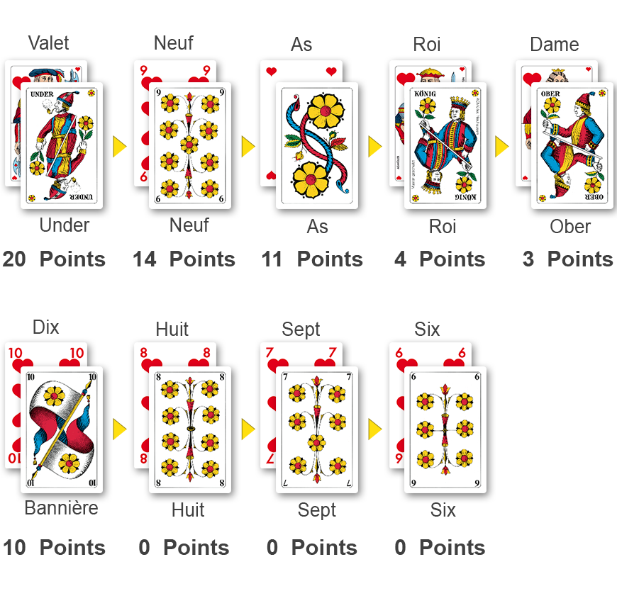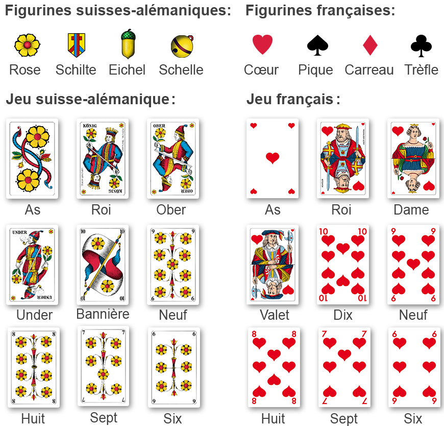 Retrouvez sur cette page les bases du Jass. Vous en saurez plus sur les cartes utilisées, leur ordre et leur valeur.