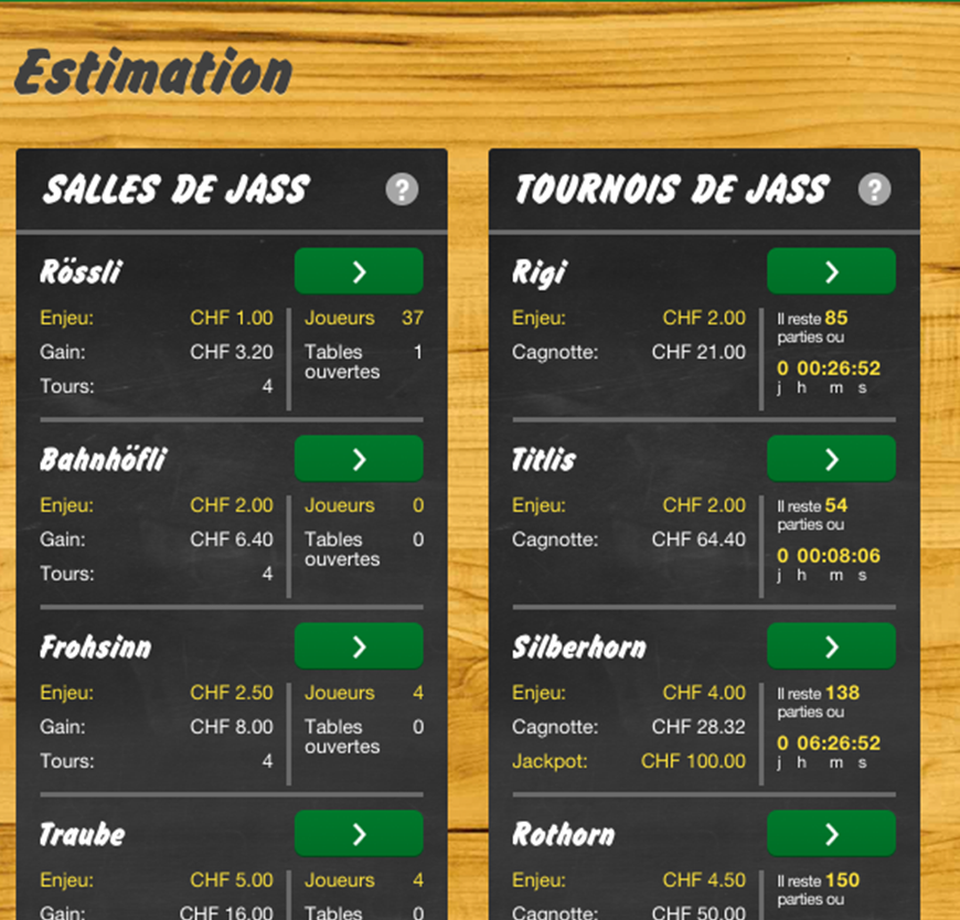 À l'Estimation, vous pouvez participer à des tournois de jass et tenter de gagner la cagnotte ou même le jackpot. Votre résultat et les résultats des autres participants au tournoi seront intégrés au classement du tournoi.
