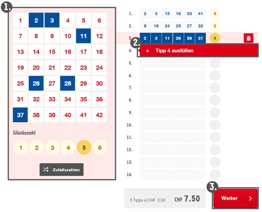 1. Sélectionnez 6 numéros (de 1 à 42) et 1 numéro chance (de 1 à 6) dans la première grille du bulletin Swiss Lotto.