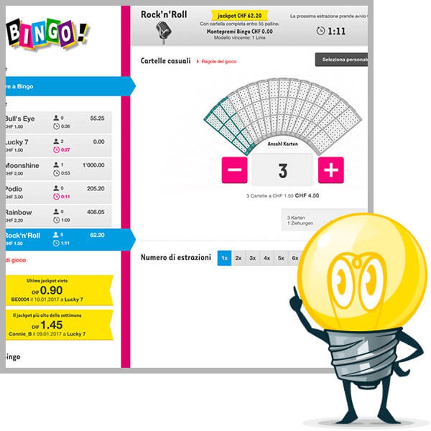 Di sicuro è una situazione che conosce bene: il jackpot del suo Bingo preferito continua a salire e già inizia la prossima partita di Bingo. Grazie alla nostra nuova modalità di acquisto veloce, in pochi secondi è già in pista per vincere il jackpot del Bingo. Basta che scelga il numero di cartelle da acquistare per entrare subito in lizza e vincere il jackpot con le cartelle selezionate in modo casuale.
