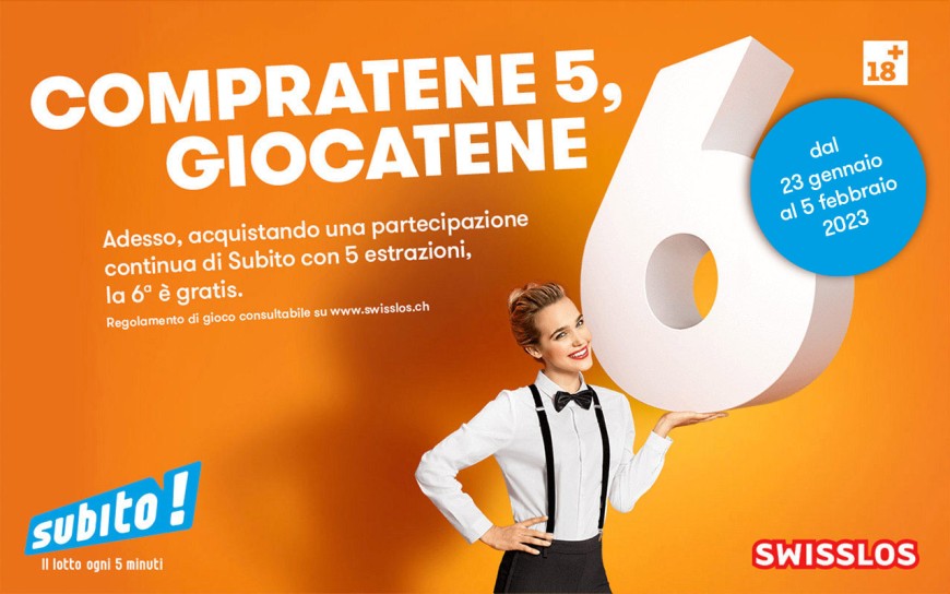 Approfitti di un’allettante promozione Subito dal lunedì 23 gennaio fino a domenica 5 febbraio 2023: all’acquisto di una partecipazione continua Subito di 5 estrazioni, ne riceverà una 6a in regalo.