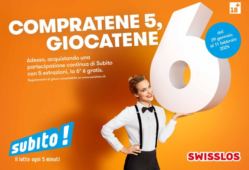 Approfitti di un’allettante promozione Subito dal lunedì 29 gennaio fino a domenica 11 febbraio 2024: all’acquisto di una partecipazione continua Subito di 5 estrazioni, ne riceverà una 6a in regalo.