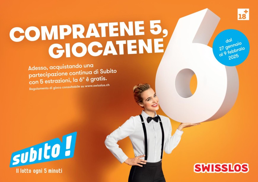 Approfitti di un’allettante promozione Subito dal lunedì 27 gennaio fino a domenica 9 febbraio 2025: all’acquisto di una partecipazione continua Subito di 5 estrazioni, ne riceverà una 6a in regalo.