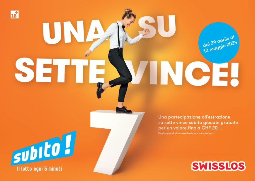 Dal 29.04. al 12.05.2024 al più tardi, una partecipazione all'estrazione su sette vince subito giocate gratuite per un valore fino a CHF 20.-.