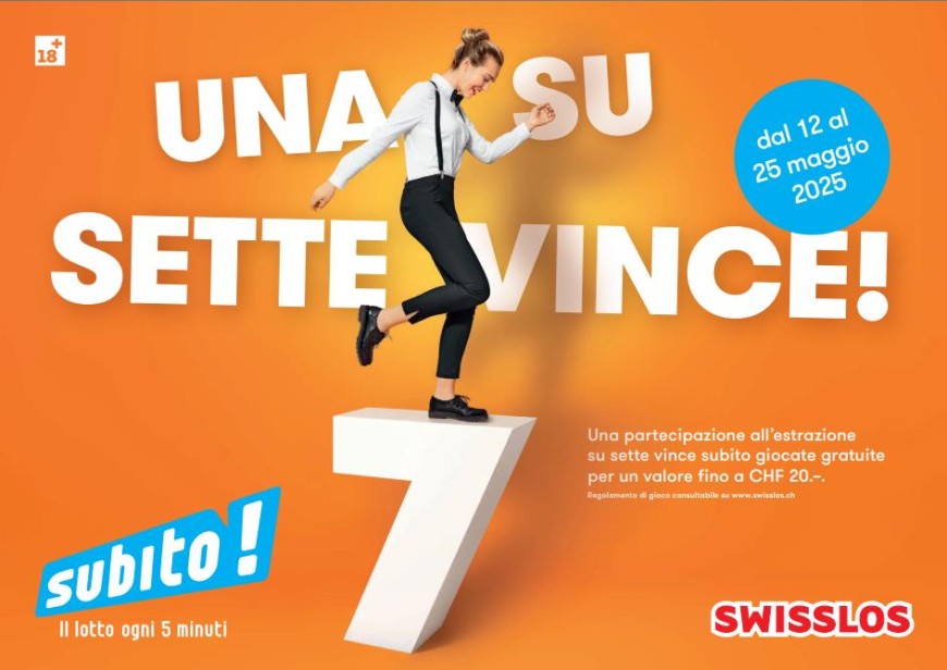 Dal 12.05. al 25.05.2025 al più tardi, una partecipazione all'estrazione su sette vince subito giocate gratuite per un valore fino a CHF 20.-.