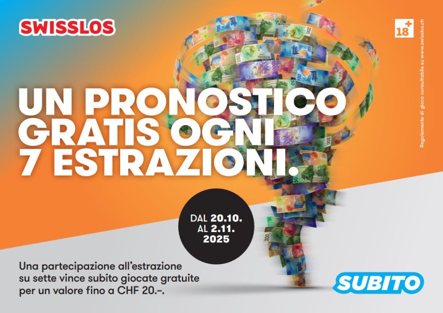 Dal 20.10. al 02.11.2025 al più tardi, una partecipazione all'estrazione su sette vince subito giocate gratuite per un valore fino a CHF 20.-.
