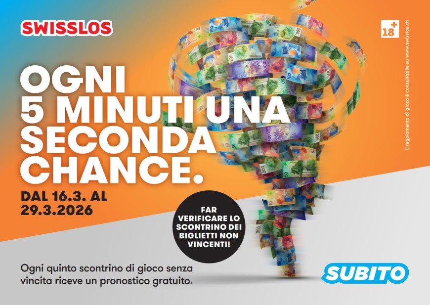 Dal 16.03. al 29.03.2026 al più tardi, uno scontrino di gioco non vincente su cinque realizzerà la vincita istantanea di unpronostico gratuito del valore di 4 franchi.