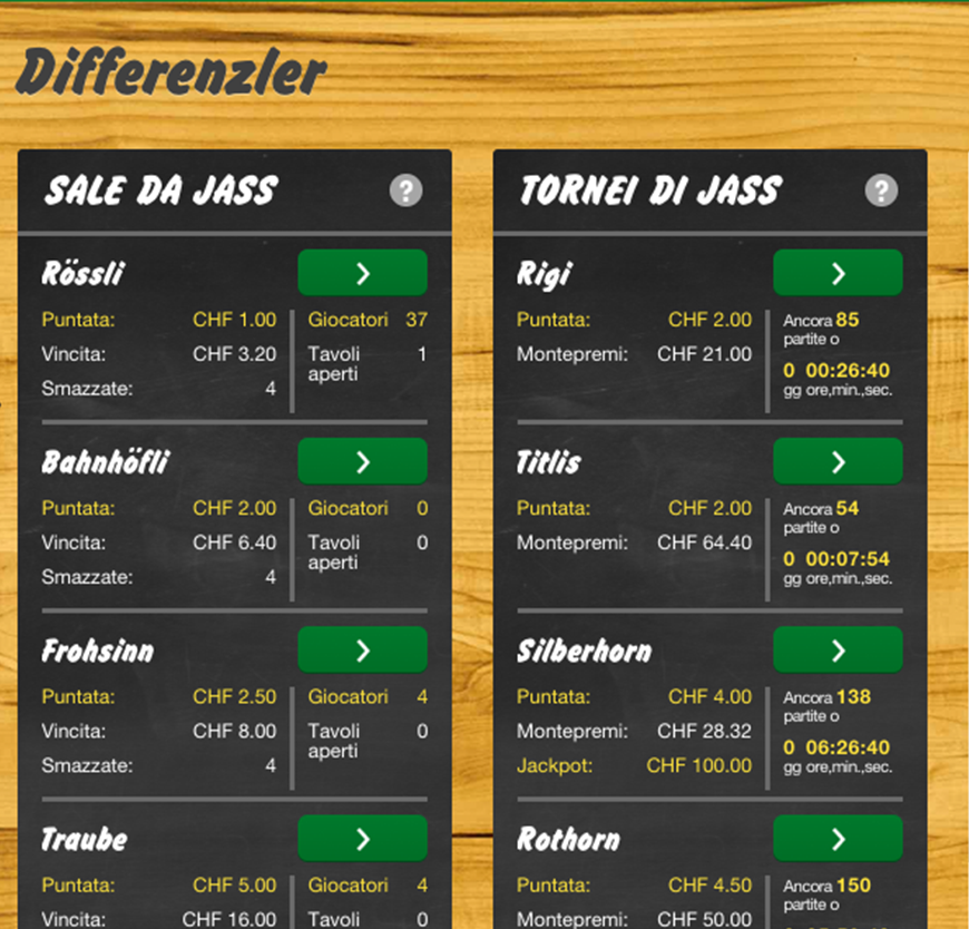 Entrare nella lobby dello jass e scegliere, in modo semplice e comodo, la modalità di jass desiderata.